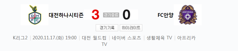 K리그2 / 국내축구 - 대전 VS 안양 (3 - 0) 2020시즌 26라운드 하이라이트 (2020년 11월 17일)