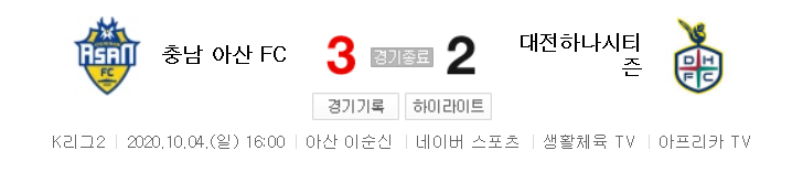 K리그2 / 국내축구 - 충남 아산 VS 대전 (3 - 2) 2020시즌 22라운드 하이라이트 (2020년 10월 4일)