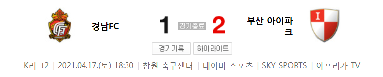 경기 결과 : 승리팀 - 부산 아이파크 (원정팀)