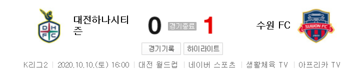 K리그2 / 국내축구 - 대전 VS 수원 FC (0 - 1) 2020시즌 23라운드 하이라이트 (2020년 10월 10일)