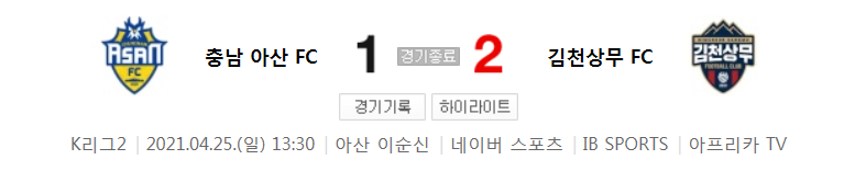 K리그2 / 국내축구 - 충남 아산 VS 김천상무 (1 - 2) 2021시즌 8라운드 하이라이트 (2021년 4월 25일)
