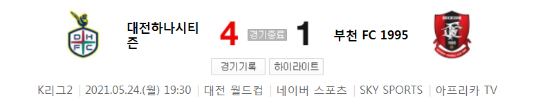 K리그2 / 국내축구 - 대전 VS 부천 (4 - 1) 2021시즌 13라운드 하이라이트 (2021년 5월 24일)
