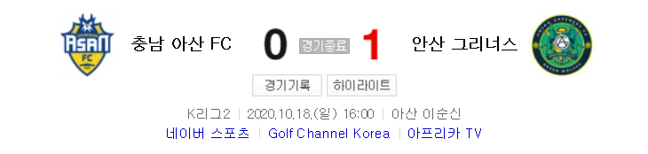 K리그2 / 국내축구 - 충남 아산 VS 안산 (0 - 1) 2020시즌 24라운드 하이라이트 (2020년 10월 18일)