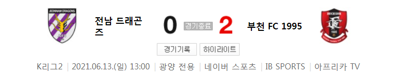 K리그2 / 국내축구 - 전남 VS 부천 (0 - 2) 2021시즌 16라운드 하이라이트 (2021년 6월 13일)