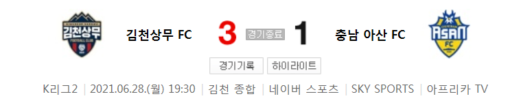 K리그2 / 국내축구 - 김천상무 VS 충남 아산 (3 - 1) 2021시즌 18라운드 하이라이트 (2021년 6월 28일)