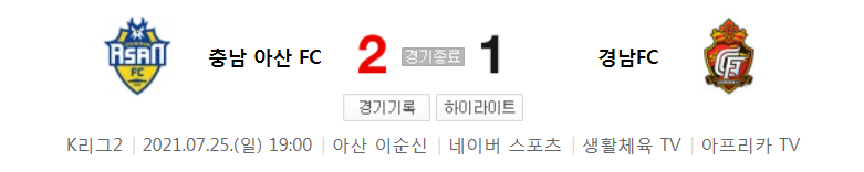 K리그2 / 국내축구 - 충남 아산 VS 경남 (2 - 1) 2021시즌 22라운드 하이라이트 (2021년 7월 25일)