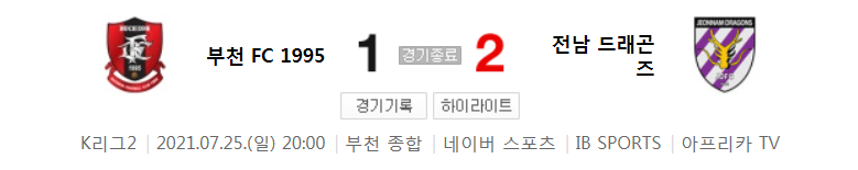 K리그2 / 국내축구 - 부천 VS 전남 (1 - 2) 2021시즌 22라운드 하이라이트 (2021년 7월 25일)