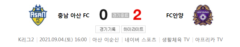K리그2 / 국내축구 - 충남 아산 VS 안양 (0 - 2) 2021시즌 28라운드 하이라이트 (2021년 9월 4일)