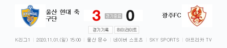 울산 (3골) : 윤빛가람(34분) - 주니오(36분) - 이동경(90분)